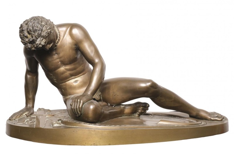 Reloj de sobremesa Imperio en bronce dorado con personaje clásico con perro y esfera en porcelana con numeración romana. Francia, Ppio. S. XIX