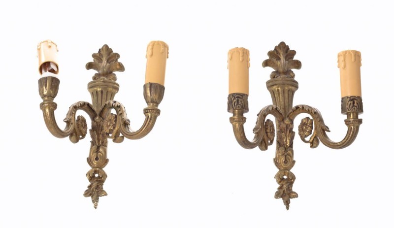 Pareja de apliques de estilo Luis XVI en bronce dorado con dos luces cada uno con brazos en forma de hojas de acanto. Pp. S. XX