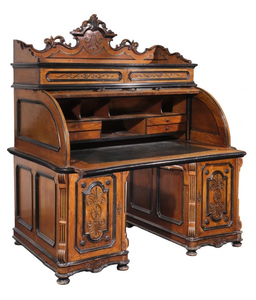 Bureau de cilindro en madera tallada y moldurada en su color con detalles ebonizados. Fns. S. XIX