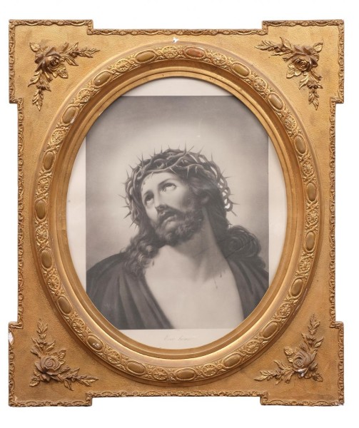 Pareja de marcos rectangulares en madera tallada y dorada con interior oval y decoración floral en las esquinas. España, Fns. S. XIX