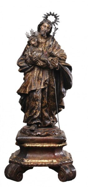 Virgen del Pilar en metal plateado y dorado sobre peana de mármol marrón en fanal de vidrio transparente y base de madera. España, S. XX