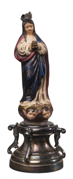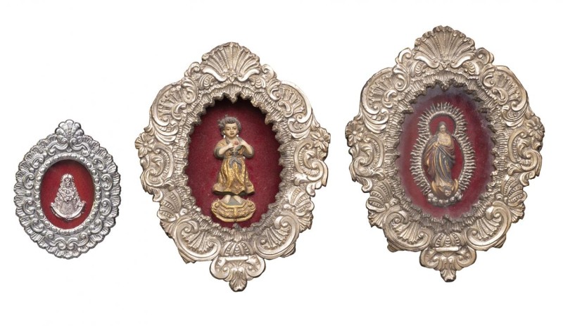 Lote compuesto por tres relicarios con marcos en metal plateado con decoración repujada de hojas de acanto y rocalla y diferentes imágenes devocionales al interior (Virgen del Rocío, Sagrado Corazón del Niño Jesús e Inmaculada Concepción). S. XX