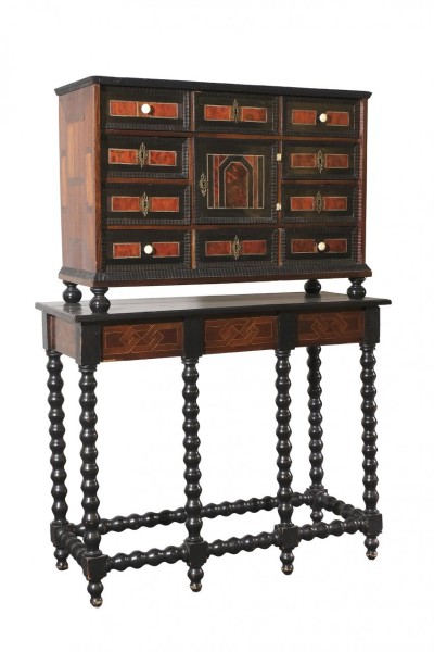 Bargueño hispano-flamenco en madera en su color y ebonizada con decoración de fileteado en hueso y placas en carey. S. XVIII