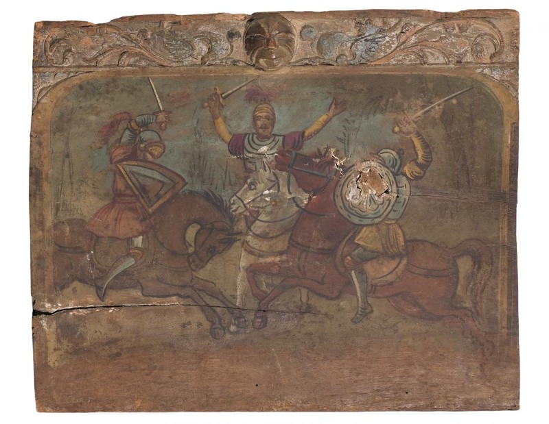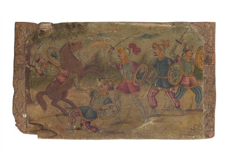 Fragmento de carro en madera tallada y policromada representando una escena de batalla. Sicilia, S. XIX