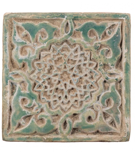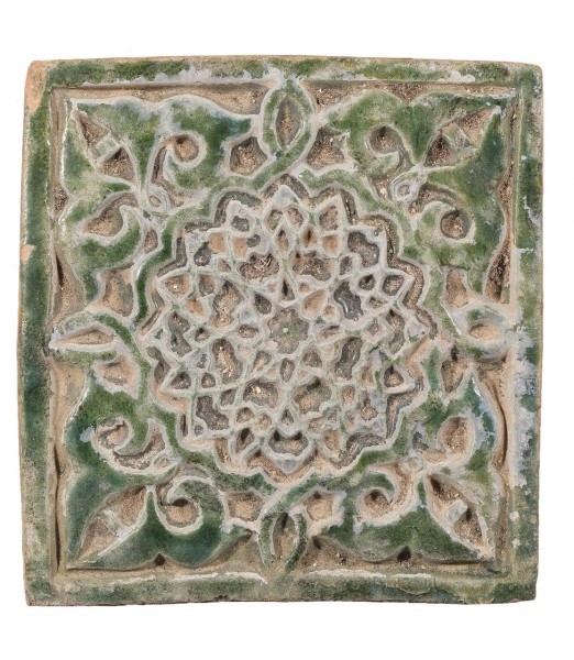 Azulejo en cerámica con restos de esmalte verde con intrincado motivo central de estrella central rodeado de elementos vegetales estilizados. España, S. XIX