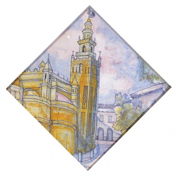 Azulejo en cerámica esmaltada polícroma de Triana de la casa Mensaque con decoración de la Giralda. Sevilla, S. XX