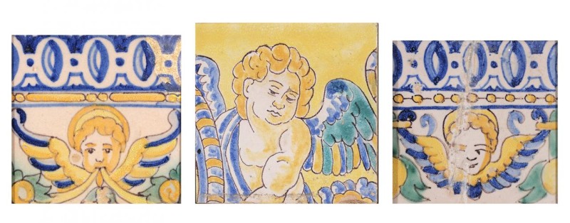 Lote compuesto por tres azulejos en cerámica esmaltada de Triana con decoración de ángeles. Sevilla, S. XIX - S. XX