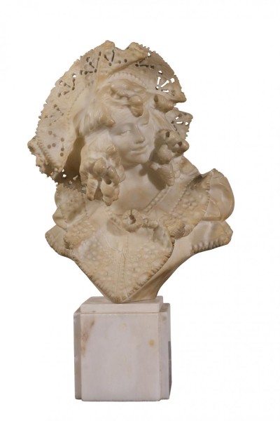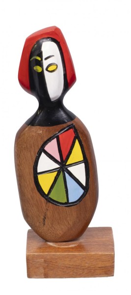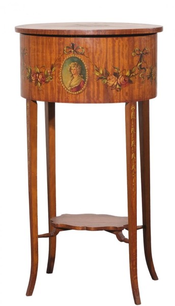Costurero en madera en decoración policromada de guirnaldas de flores y medallón central con retrato femenino. 3º tercio del S. XIX