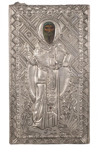 Icono ortodoxo probablemente de San Alejandro sobre tabla con ritza en metal plateado. S. XX