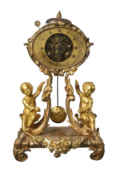 Reloj de sobremesa en bronce dorado al mercurio con base flanqueada por dos amorcillos. Francia, S. XIX