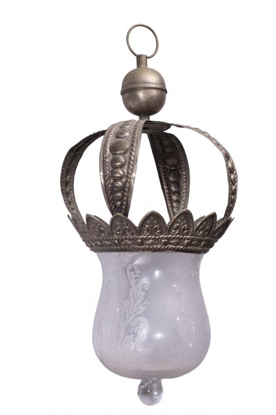 Lámpara de techo con parte superior en forma de corona en metal plateado con decoración repujada y tulipa en vidrio transparente con decoración vegetal grabada al ácido. España, S. XX