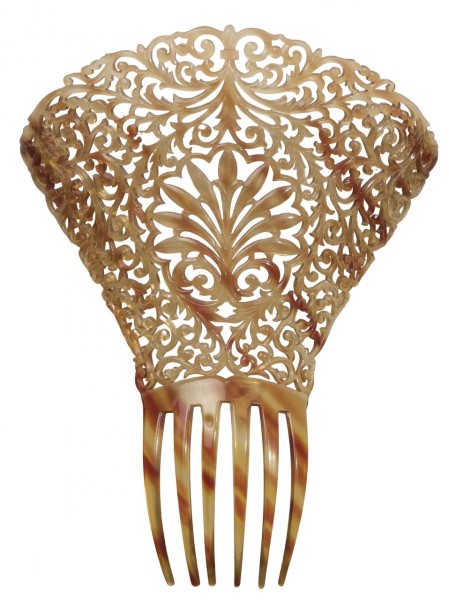 Abanico cristino con varillaje en hueso calado y parcialmente dorado. País en tela pintada a mano con escena de galanteo en anverso y paisaje en reverso. España, S. XIX.