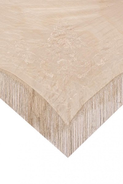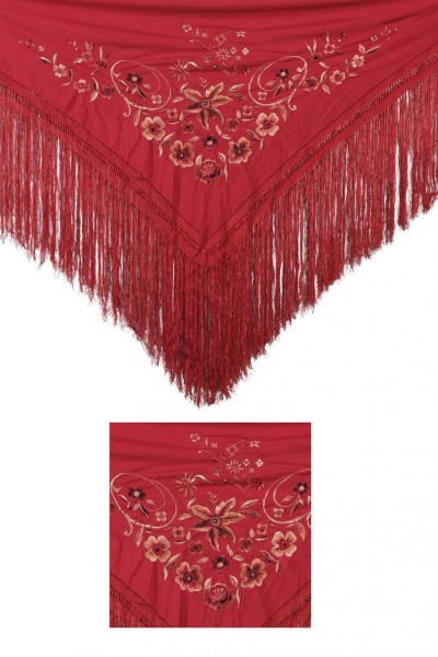 Mantón de Manila en seda de color rojo con motivos florales bordados a mano en diferentes tonos de beige y rojos en una de las esquinas. S. XX
