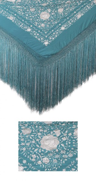 Mantón de Manila en crespón de color turquesa con decoración floral bordada a mano en color blanco. S. XX
