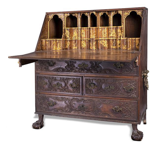 Cómoda buró en madera de nogal con tres cajones al frente y tapa superior abatible. Exterior con decoración de roleos y rocallas en bajorrelieve y herrajes en bronce. Interior con chinerías lacada en dorado con paisajes. España, S. XVIII.