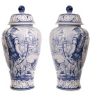 Pareja de jarrones en cerámica esmaltada en azul y blanco con paisaje y escena de caza. S. XX.