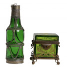 Lote formado por joyero y pequeña botella en vidrio tono verde con filigrana. S. XX.