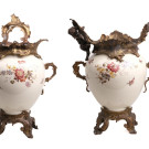 Pareja de copas en cerámica esmaltada con montura en calamina. Ppios. S. XX.