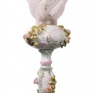 Quinqué convertido en lámpara con pie en porcelana esmaltada con decoración floral de rosas y tulipa en vidrio. Probablemente Alemania, S. XIX