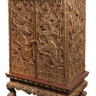 Mueble oriental en madera tallada y dorada con dos puertas frontales que albergan personajes. S. XX