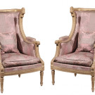 Pareja de sillones bergère de estilo Luis XVI en madera tallada y lacada en color hueso con tapicería en color rosas con decoración vegetal. Francia, S. XX