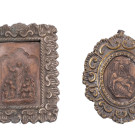 Lote compuesto por dos relicarios en terracota con escenas de la Piedad y Jesús con los niños y marcos de estilo rococó en metal con decoración repujada de rocalla y tornapuntas. España, S. XIX