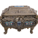 Caja en metal plateado con decoración repujada con medallones esmaltados con motivos florales con cuatro cabezas de angelitos rematando las esquinas, uno en el frontal y otro en la trasera de la tapa. España, Fns. XIX