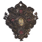 Relicario en metal plateado con repujada de rocalla y hojas de acanto con imagen central de Icono acompañado por cuatro reliquias. España. S. XIX
