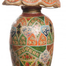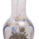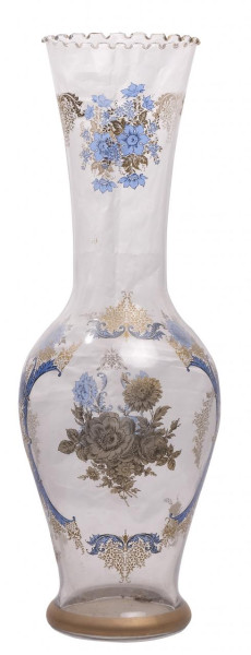 Jarrón probablemente de Bohemia en vidrio transparente con decoración floral y vegetal en azul y dorado. S. XX