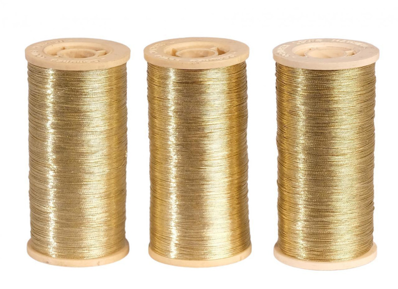 Lote compuesto por tres carretes de hilo entrefino en color oro limón. S. XX