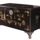 Arcón oriental en madera de alcanfor lacada en negro con decoración vegetal, pagodas, personajes y embarcaciones en nácar. China, Fns. S. XIX