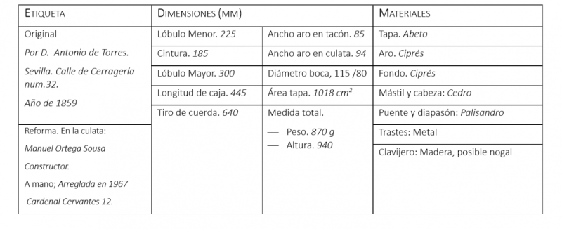 «Contaba el violero francés Daniel Friederich, que es aspiración de cada guitarrero alcanzar un sonido personal a partir de fabricaciones sencillas. Que los estilos de cada uno están sujetos a sus conocimientos, y estos se basan en la observación de los maestros del pasado y la práctica, la perseverancia, la audacia... y también en los éxitos, que son necesarios(1). Sin esos mimbres es imposible encontrar una expresión propia, y menos desarrollarla. Ese milagro se produjo en el último cuarto del siglo XIX, de la mano del violero almeriense Antonio de Torres Jurado (1817-92). Torres, es el constructor más determinante en la historia de la Guitarra Española. Su producción se caracteriza por haber obtenido una sonoridad propia -el sonido Torres- que cambiará el significado del instrumento y su papel en la música moderna, pasando de mero acompañamiento a convertirse en solista de conciertos y protagonista de partituras. La calidad de sus piezas y la aceptación posterior de sus novedades, lo ponen a la altura de los grandes luthieres de la historia de la música. Es por ello que la documentación de alguna de sus obras provoca el interés del ambiente especializado. Aparecen poco, pero a veces despiertan del letargo de un armario o la desmemoria familiar. A esta circunstancia obedece la pieza que presentamos, propiedad de Doña Carmen Vicente Romero desde la década de 1950. Un ejemplar fabricado en 1859 en el taller sevillano del maestro, en calle Cerrajería. Puede que la principal característica de la obra de Torres sea indescifrable, al menos es difícil señalar solo una. Quizás el anhelo por sublimar la guitarra fuese su principal leitmotiv. Era conocedor del punto en que partía (la tradición vihuelista que le precede), y las debilidades inherentes del instrumento. Concluyó que necesitaba multiplicar sus posibilidades sonoras, y de manera empírica y personal -no contó con discípulos o aprendices- se dispuso a obtener un modelo diferente. Recogió las características de cada escuela constructiva y las concentró en una plantilla nueva, modificando la silueta del instrumento. Aumentó la longitud de tiro del cordaje y sobre todo el volumen de su caja armónica para mejorar su resonancia y multiplicar los tonos. Reforzó su interior con un sistema de barras y varetas, desarrollando el esquema de estas en abanico. Consolidó un nuevo puente e investigó con todo tipo de maderas a las que sometió a finos laminados y curvatura; varió el perfil de los aros y la situación de la cintura; es decir, hizo el camino completo hacia la guitarra actual. Este proceso, que singularmente cristaliza muy al principio de su producción, estuvo enriquecido por su afición al toque y el asesoramiento de los principales intérpretes del momento, que desarrollaron a través de sus guitarras una forma de expresión mucho más rica que la conocida hasta esa fecha. A pesar del localismo y el carácter artesano de su producción, tuvo conciencia de su época y del lugar al que quería llevar la guitarra. Sus obras se convierten en catalizador de la transición musical del Romanticismo del último cuarto del siglo XIX, al Nacionalismo preciosista y virtuoso, que elevará a los teatros piezas como la rondeña, el bolero, la jota, hasta ese momento instaladas en la categoría de lo vulgar. Para ello necesitaba una herramienta capaz de amplificar los sonidos y matices de la guitarra conocida. El catálogo actualmente acreditado de Torres suma ochenta y ocho guitarras y una bandurria. Fue editado por primera vez por José Luís de Romanillos en 1987, llevándose a cabo su última actualización en 2020, dos años antes de su fallecimiento (2). En ese lapso el inventario estuvo abierto, y de manera residual se fueron sumando ejemplares que documentó por motivos de restauración o venta. Como el propio autor pensaba, tendría que ser un registro permeable a la suma de ejemplares futuros, aunque de momento el número es exiguo, y la aparición de uno supone un revuelo en el ambiente cultural por su rareza y el valor que supone su autoría (podrían compararse a los sleepers de disciplinas como la pintura). El compendio organiza la producción en dos grupos divididos por la localización del taller: Sevilla entre 1852-69 (First Epoch), y Almería de 1875 al 92 (Second Epoch). Las guitarras se identifican con referencias que aluden a ambos, encabezadas por los acrónimos FE o SE seguidos de una secuencia numérica o alfanumérica. En las almerienses, la matrícula sigue la notación original signada por Torres en sus etiquetas(3) ; sin embargo, las sevillanas carecen de esta seriación (contienen la autoría, domiciliación de la tienda taller y el año de hechura). En este caso, el número de referencia lo asignó Romanillos siguiendo un criterio cronológico a medida que iba compilando el inventario. De esta primera época conservamos treinta y nueve instrumentos(4). La Guitarra de Carmen Vicente Romero que presentamos en estas páginas, podría matricularse como FE 10B; es decir solo se conocen diez como propias de la producción del maestro hasta 1859. Este momento es determinante en la obra de Torres, por consolidar sus conocimientos y desarrollar su producción más creativa. El arrojo de su juventud y las posibilidades que pudo encontrar en Sevilla: variedad de maderas, salida comercial del producto, contraste de su actividad con la de otros violeros, y sobre todo el contacto con un ambiente cultural propicio, lo colocan tempranamente como un referente profesional. Entre 1865-60 había construido para los grandes solistas del momento: José Martínez Toboso, Julián Arcas o Francisco Tárrega. La trascendencia de estos instrumentos es tan grande, que servirán a intérpretes de generaciones posteriores, como Miguel Llobet o Emilio Pujol, aunque puede decirse que esa tendencia ha llegado a nuestros días. Es un momento de búsqueda en el que realiza la transición de la guitarra Romántica 