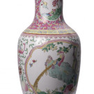 Jarrón "Familia Rosa" en porcelana esmaltada con decoración de pavos reales en cartelas y flores. China, S. XIX - XX