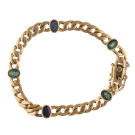 Pulsera de eslabón barbado en oro amarillo de 18k con tres esmeraldas en talla oval -peso estimado: 1,65ct- y pareja de zafiros en talla oval -peso estimado:1,85ct-. Cierre de cajetín. Peso total de la pieza: 17,9g.