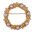 Broche circular en plata dorada ornamentado con perlas cultivadas. Diámetro: 4cm.