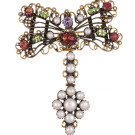 Broche/colgante en plata dorada ornamentado con granates, peridotos, amatista y perlas cultivadas. Medidas: 8,5 x 7cm.