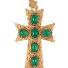 Colgante en forma de cruz en plata dorada ornamentada con ágatas verde en talla cabujón. Medidas: 7 x 3,5cm.