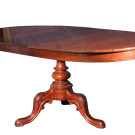 Velador victoriano convertido en mesa de comedor en madera de caoba con tablero oval sobre pata central torneada rematada en tres pies con decoración tallada. Inglaterra, S. XIX
