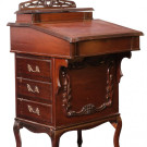 Escritorio Davenport victoriano en madera de nogal tallada con tapa abatible forrada en piel marrón gofrada en dorado con interior compartimentado, cajones laterales y patas cabriolé. Inglaterra, Fns. S. XIX