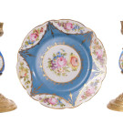 Lote compuesto por un plato y dos candelabros en bronce y porcelana esmaltada con decoración floral sobre fondo azul siguiendo modelos de Sèvres. Francia, S. XIX