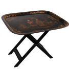 Bandeja en metal lacado en negro con dos personajes centrales rodeados de flores y hojas en dorado. China, S. XIX