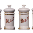 Lote formado por seis albarelos de farmacia en cerámica esmaltada con realces en dorado. Ppio. S. XX