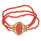 Pulsera en estilo Napoleón III de tres hilos de cuentas de coral del Mediterráneo facetadas con camafeo central en oro amarillo 18k. Cierre de cajetín. Largo: 19cm. Peso total de la pieza: 14,85g.