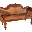 Sofá fernandino en madera tallada con respaldo de copete mixtilíneo y brazos en góndola con decoración de hojas de acanto, tornapuntas y flores sobre pies torneados. España, primer tercio del S. XIX