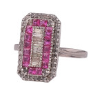 Anillo estilo Navette en oro blanco bajo con rubíes sintéticos y marcasitas. Peso total de la pieza: 4,24g.