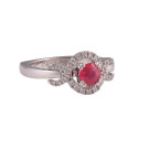 Sortija en oro blanco con rubí central de 0,65ct en talla brillante con orla de diamantes de 0,26ct. Peso total de la pieza: 6,53g.