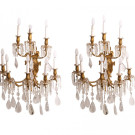 Pareja de apliques de ocho luces cada uno de estilo Rococó en bronce dorado al mercurio con decoración de rocalla y lágrimas en vidrio transparente. S. XIX