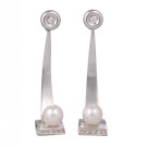 Pendientes largos en oro blanco de 18k con brillante talla diamante engastados en chatón y perlas cultivadas de 0,5mm de diámetro. Cierre a presión. Peso total de las piezas: 8,35g.