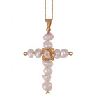 Colgante en forma de cruz con perlas biwa y hojillas en oro amarillo de 18k con cadena de oro. Largo total: 36cm. Peso total de las piezas: 4,74g.