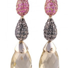 Pendientes largos en oro amarillo de 18k con zafiros rosa, brillantes negros y lágrimas de citrino de 18x11mm. Cierre omega. Peso total de las piezas: 10,82g.